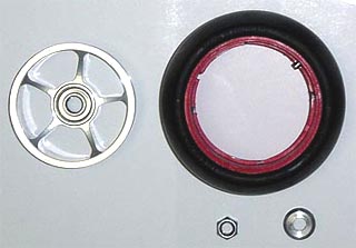 (ホイール、タイヤです。タイヤに赤いリムが付いていますが、これは磨り減ったときに赤い部分が見えたら交換です。)