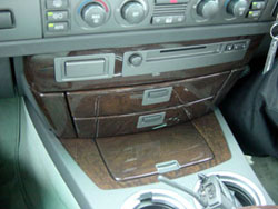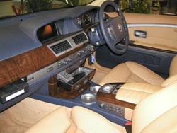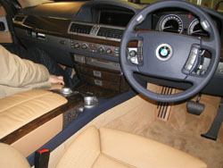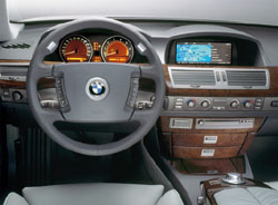 【Report by 中橋】 内装の仕様の違うモデルに乗りましたが、当然ながら高級でひろびろ。 運転席に座ると、iDriveコンセプトとして、 ドライビング機能とコンフォート機能の2つのゾーンにわかれた構成になっています。 ドライビング機能部分はステアリングホイールに集約、コンフォート機能部分は センターコンソールにまとめられています。 メーター類、ディスプレイの視認性は非常に高いです。 特筆すべきは目に見えるスイッチ類が激減したことでしょう。 メルセデスS320と比べると雲泥の差です。 iDriveは内装を広々とした印象を与えるのに役立っています。 iDriveの操作については後述しますので、そこを除いてレポート。 センタートンネルのシフトレバーがなくなり、完全なシフトバイワイヤーです。 そのため、いままでのBMWとはかなり操作系のポジションが変わってしまったことは よい点でもあり悪い点でもあるのかなと思いました。 いきなり乗り込んで走り出しながら無意識に操作できるかといえば、 僕には無理でした。 いつか、ゼロから機能を追及したニューデザインに移行するのであれば まず7シリーズからというのは正解なのだろうと思います。 慣れれば今までより便利なのはよくわかるつくりです。 また引き出し・小物いれ、ドリンクホルダーなどかなり細かい部分で 便利さがアップしています。 国産車かと思わせるほどです。 フロントアームレスト下部のセンターコンソールの収納スペースは予想よりはるかに深く広く、 A4サイズの書類がかなり収納できるぐらいでした。 ここにはドコモの携帯電話をつなぐケーブルなどもありITバリバリな 一面ものぞかせます。 電話との融合という面では、ハンズフリー対応、電話をかけるための テンキー(?)、プライバシーを守るための受話器などが組み込まれています。 使わないときはすっきりと隠されるので普段は気にする必要もないつくりです。 シートは豪華な皮に目が奪われますが、すわりごこちも文句なし。 ポジション調整は当然電動。さらにマルチファンクションコンフォートシートに 至っては調整箇所が多すぎてベストなポジションってなんだろう?と 頭が混乱するほどでした。 シートクッション部がツーピース構造になっていて、周期的に上下に動いて 疲労を軽減するアクティブシートもうらやましい装備のひとつ。 シートヒーター/ベンチレーション装着車はさらに快適なのでしょう。 シートクッション部分とバックレスト部分の温度すら個別に調整可能と いわれてももはや僕の理解を超えています。 ステアリング周りもトピックスだらけです。 マルチファンクションステアリングホイールで、シフトモード(S/M/D)の切り替え、電話、 オーディオ、プログラマブルスイッチを操作可能です。 またプログラム式クルーズ・コントロールがステアリングの左下のレバーに設置されて います。使用頻度の高い速度をスイッチ操作で呼び出すことができる便利な 仕様になっています。 ステアリング丈夫についた銀色のボタンはステップトロニックですが、これは オートマチックの紹介で後述します。 メーター周りもインフォメーションディスプレイと呼び、ただのメーターパネルとは 一味違う作りです。 最新のLCDによる表示は常に見やすく、色調・輝度が自動調整されています。 BMW風のオレンジの照明もいい感じです。 |