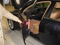 【Report by 玉テク】 無段階式のドアブレーキとして、 どの角度でもしっかりホールドされるストッパーが装着されている。狭い場所での乗降時、 かなり便利だろう。しかし、クリック感が無いのに止まるのはちょっと不思議な感じがした。 (写真右:ドア下部のダンパーがその仕掛け) また、オプションのソフトクローズオートマチック機能によりラッチ位置から電動モーターにて 自動で閉まる装備は付けたい装備だ。 【Report by 中橋】 新型7シリーズは乗り込むときからいままでと違います。 ドアがどこでも止まるだけにとどまらず、コンフォートアクセスとして ドライバーがドアに触れると同時にドアロックを解除するシステムも設定されます。 さらにドアハンドルにも小さなスポットランプが点灯し、ドア付近の地面を照らしてくれる 細かい配慮にも驚きました。 |