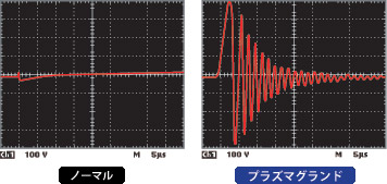 PLASMA GROUNDを装着することで電圧が約10倍に増幅するとともに大きな交流波形が発生。