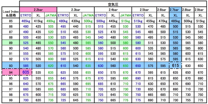 ロードインデックスは「94」なので、前輪/後輪それぞれの空気圧から数字を追っていくと、