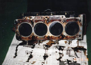 どこが弁やらプラグやら…とほほ状態のシリンダヘッド下側。ひどいなぁー。