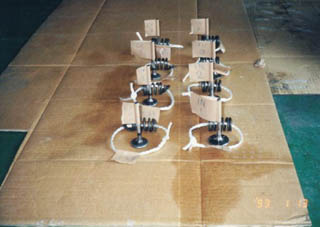 手押し車とビールの空ケースで作った仮設作業台。移動が容易で、縛りつける